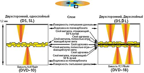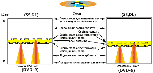 На рис. 4 (слева) представлена наиболее распространенная конструкция одностороннего двухслойного диска DVD, а справа — альтернативная. Разница между ними заключается в том, что в первом случае металлические слои с данными расположены на разных сторонах (половинках) диска, а во втором на одной. Луч лазера должен проходить через полупрозрачный слой металла и слой адгезива (клея), склеивающего две половинки диска, причем адгезив не должен задерживать поток света.