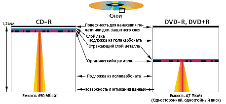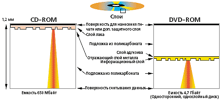 Слой металла и информационный слой в CD размещены очень близко к его поверхности со стороны этикетки, а в DVD они находятся в середине диска.