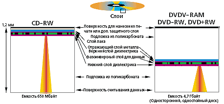 Диски RW и RAM. Слой для записи данных на оптических дисках для многократной записи (CD-RW, DVD-RW, DVD+RW, DVD-RAM) расположен между поликарбонатной подложкой и металлическим отражающим слоем (рис. 3). Информационный слой, который изготовлен из фазоинверсного материала — пленки металлического сплава (серебро, индий, сурьма или теллур), заключенной между двумя слоями диэлектрика, находится между поликарбонатной подложкой и непрозрачным или полупрозрачным слоем металла.