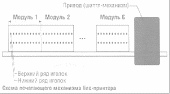 Рассмотрим принципиальное устройство печатающего механизма line-принтера на примере модели Genicom 4490. Для печати используется шесть модулей (головок), жестко закрепленных на шасси. Каждый модуль содержит матрицу иголок 2х11. Таким образом, получается два расположенных друг над другом ряда из 66 иголок, позволяющих одновременно печатать две линии. Двухрядный модуль обеспечивает высокую надежность. Даже при выходе из строя одного ряда печать автоматически продолжается без потери качества, хотя и с меньшей скоростью. У serial-принтеров, например Epson LX-300, головка пробегает всю строку. В отличие от них, модуль line принтера лишь колеблется в пределах нескольких символов. (рис. Схема печатающего механизма line-принтера).