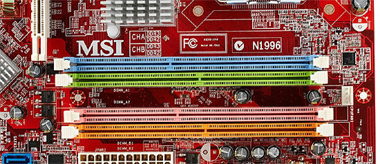 Мал. 5б. Зовнішній вигляд типових роз'ємів на системній платі (комбо) для установки модулів пам'яті DDR3 (голубий/рожевий) і DDR2 (зелений/оранжевий)