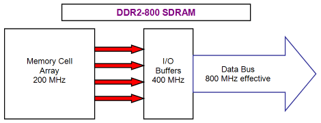 Найбільш природним чином вирішення проблеми досягнення вищих тактових частот при переході від DDR до DDR2 є зниження тактової частоти внутрішньої шини даних удвічі по відношенню до реальної тактової частоти зовнішньої шини даних (частоті буферів введення-виводу). Так, в даному прикладі мікросхем пам'яті DDR2-800 (мал. 2) частота буферів введення-виводу складає 400 Мгц, а «ефективна» частота зовнішньої шини даних - 800 Мгц (оскільки суть технології Double Data Rate залишається в силі - дані як і раніше передаються як по висхідному, так і по низхідному напівперіоді синхросигналу). При цьому частота внутрішньої шини даних складає всього 200 Мгц, тому для передачі 1 біта (по кожній лінії даних) за такт зовнішньої шини даних з ефективною частотою 800 Мгц на кожному такті 200-мгц внутрішньої шини даних потрібно передати вже 4 бітів даних. Іншими словами, внутрішня шина даних мікросхеми пам'яті DDR2 повинна бути в 4 рази ширше в порівнянні з її зовнішньою шиною. Така схема доступу до даним, реалізована в DDR2, називається схемою «4n-передвибірки» (4n-prefetch). Її переваги перед схемою 2n-prefetch, реалізованою в DDR, очевидні. З одного боку, для досягнення рівної пікової пропускної спроможності можна використовувати удвічі меншу внутрішню частоту мікросхем пам'яті (200 Мгц для DDR-400 і всього 100 Мгц для DDR2-400, що дозволяє значно понизити енергоспоживання). З іншого боку, при рівній внутрішній частоті функціонування мікросхем DDR і DDR2 (200 Мгц як для DDR-400, так і DDR2-800) останні характеризуватимуться удвічі більшою теоретичною пропускною спроможністю. Але очевидні і недоліки - функціонування мікросхем DDR2 на удвічі меншій частоті (в умовах рівності теоретичної пропускної спроможності пристроїв DDR і DDR2) і використання складнішої схеми перетворення «4-1» приводить до відчутного зростання затримок, що і спостерігалося на практиці в ході дослідження перших зразків модулів пам'яті DDR2.