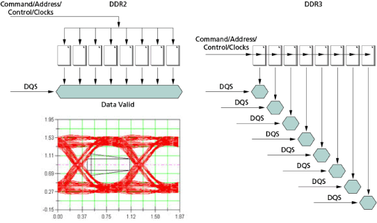 Відмінність між способом передачі адрес і команд, сигналів управління і тактової частоти в модулях пам'яті DDR2 і DDR3 (на прикладі модулів, фізичний банк яких складений з 8 мікросхем розрядністю x8) представлено на мал. 7. У модулях пам'яті DDR2 подача адрес і команд здійснюється паралельно на всі мікросхеми модуля, у зв'язку з чим, наприклад, при зчитуванні даних, всі вісім 8-бітних елементів даних виявляться доступними в один і той же момент часу (після подачі відповідних команд і закінчення відповідних затримок) і контролер пам'яті зможе одночасно прочитати всі 64 біти даних. В той же час, в модулях пам'яті DDR3 внаслідок застосування fly-by архітектури подачі адрес і команд кожна з мікросхем модуля отримує команди і адреси з певним відставанням щодо попередньої мікросхеми, тому елементи даних, відповідні певній мікросхемі, також виявляться доступними з деяким відставанням щодо елементів даних, відповідних попередній мікросхемі в ряду, що становить фізичний банк модуля пам'яті. У зв'язку з цим, з метою мінімізації затримок, в модулях пам'яті DDR3, в порівнянні з модулями DDR2, реалізований декілька інший підхід до взаємодії контролера пам'яті з шиною даних модуля пам'яті. Він називається «регулюванням рівня зчитування/запису» (read/write leveling) і дозволяє контролеру пам'яті використовувати певний зсув за часом при прийомі/передачі даних, відповідне «запізнюванню» надходження адрес і команд (а отже, і даних) в певну мікросхему модуля. Цим досягається одночасність зчитування (запису) даних з мікросхем (у мікросхеми) модуля пам'яті.