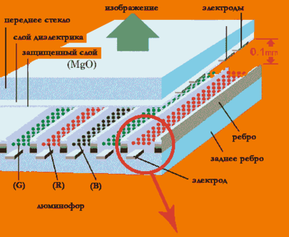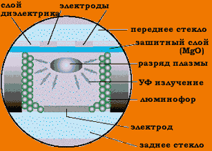 Формирование изображения в плазменном дисплее происходит в пространстве шириной примерно 0,1 мм между двумя стеклянными пластинами, заполненном смесью благородных газов – ксенона и неона. На переднюю, прозрачную пластину нанесены тончайшие прозрачные проводники, или электроды, а на заднюю – ответные проводники. Подавая на электроды электрическое напряжение, можно вызвать пробой газа в нужной ячейке, сопровождающийся излучением света, который и формирует требуемое изображение. Первые панели, заполнявшиеся в основном неоном, были монохромными и имели характерный оранжевый цвет. Проблема создания цветного изображения была решена путем нанесения в триадах соседних ячеек люминофоров основных цветов – красного, зеленого и синего и подбора газовой смеси, излучающей при разряде невидимый глазом ультрафиолет, который возбуждал люминофоры и создавал уже видимое цветное изображение (три ячейки на каждый пиксель).