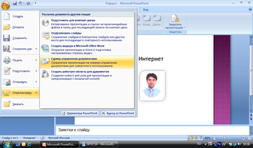PowerPoint предлагает стиль работы, который соединяет базовые инструменты повышения производительности с возможностями Интернет, упрощая процесс обмена информацией и совместной работы над проектами. PowerPoint позволяет превратить интрасеть в двустороннее рабочее пространство и дать пользователям единую среду для сотрудничества, публикации, совместного использования и управления документами. При работе с PowerPoint опубликовать презентацию непосредственно в глобальной информационной сети оказывается так же легко, как сохранить ее на локальном жестком диске, Рисунок 6. Это помогает пользователям создавать и передавать коллегам самое ценное достояние своей организации – информацию.