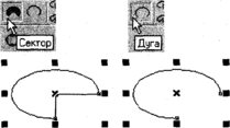 ллипсы также имеют на панели свойств свои специальные элементы управления. Кнопки Pie (Сектор) и Arc (Дуга) трансформируют эллипс в "пирог" с вырезанной долькой и просто в эллипсную кривую.