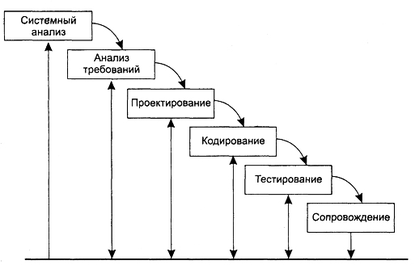 Очень часто классический жизненный цикл называют каскадной или водопадной моделью, подчеркивая, что разработка рассматривается как последовательность этапов, причем переход на следующий, иерархически нижний этап происходит только после полного завершения работ на текущем этапе (рис. 1.1).