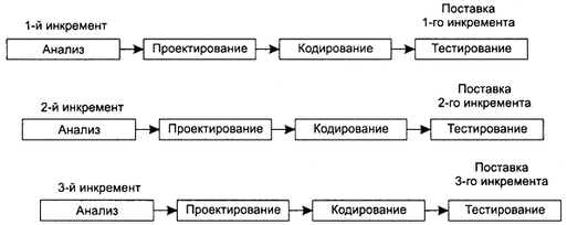 Каждая линейная последовательность здесь вырабатывает поставляемый инкремент ПО. Например, ПО для обработки слов в 1-м инкременте реализует функции базовой обработки файлов, функции редактирования и документирования; во 2-м инкременте - более сложные возможности редактирования и документирования; в 3-м инкременте - проверку орфографии и грамматики; в 4-м инкременте - возможности компоновки страницы.