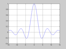 >> fplot('sin(x)/x', [-15,15]); grid on