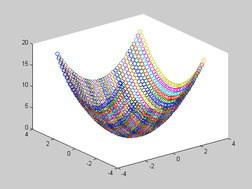 plot3 (X, Y, Z, S) — обеспечивает построения, аналогичные рассмотренным ранее, но со спецификацией стиля линий и точек, соответствующей спецификации команды plot. Ниже дан пример применения этой команды для построения поверхности кружками: