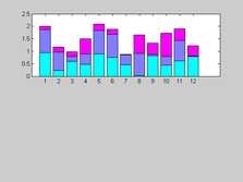 >> subplot(2,1,1), bar(rand(12,3),stacked'), colormap(cool)