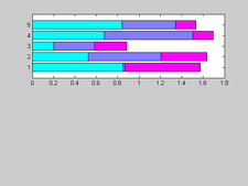 >> subplot(2,1,1), barh(rand(5,3), 'stacked'),colormap(cool)
