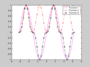 >> plot(x,y1,'-m',x,y2,'-.+r',x,y3,'--ok')