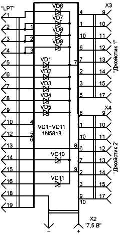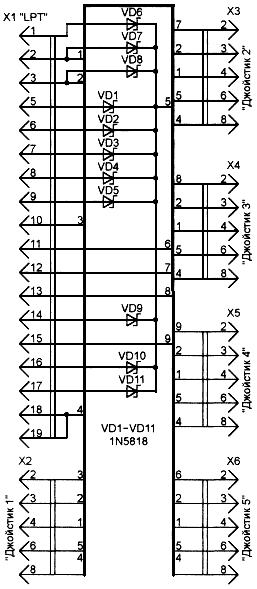 Катоды всех имевшихся ранее и вновь введенных диодов соединены параллельно. Таким образом, в питании джойстика участвуют все линии порта, на которых программно установлен или может быть установлен уровень лог. 1.