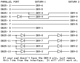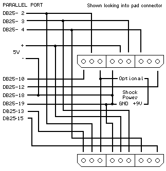 Вид разъёма на рисунке показан так, если на него смотреть со стороны штырьков. Имеется возможность подключить одновременно 2 джойстика. В данном случае все идущие ко второму джойстику провода на приведенной схеме дублируются кроме подключенных к DB25-10 и DB25-12. Провод второго джойстика вместо DB25-10 подключается к DB25-13, а вместо провода DB25-12 соответственно DB25-15.