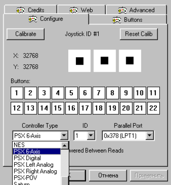 После этого выбираем правильный адрес вашего LPT-порта (можно посмотреть в "Система" > "Устройства" > "Порты COM и LPT", обычно он 378 или может быть 278 при использовании мультикарты). Если выбрать закладку "Buttons", то вы попадете в окно переназначения кнопок. Бывает, для той или иной игры требуется другое расположение кнопок. При подключении джойстика по схеме на верхнем рисунке (напряжение питания +5В используется от LPT порта) и его неустойчивой работе в меню "Adwanced" в некоторых случаях надо будет экспериментально подобрать значение Scan Delay. Другие закладки, как правило, не требуют никаких изменений. При подключении ещё одного джойстика аналогично добавляем его в "Панель управления" > "Игровые устройства".