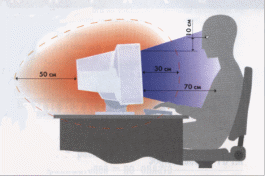 Если вы думаете о собственном здоровье, и без того подорванном многочасовыми бдениями над отчётностью, стоит усвоить несколько полезных правил. Электромагнитное поле вокруг монитора имеет форму яйца. Тупой конец (30см) находится с лицевой стороны, острый (50см) -с задней. Те же 50см являются “опасной зоной" по бокам. Вывод: вы должны быть вне этого пространства.
