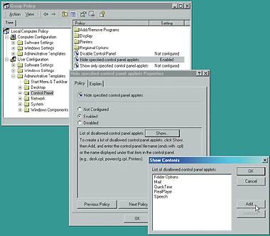 Можно также просто убрать значки Панели управления в Windows XP или Windows 2000 с помощью программы "Групповая политика". Выберите "Пуск? Выполнить", введите команду gpedit. msc и нажмите. Затем спускайтесь по дереву в левой части раскрывшегося окна, выбрав следующий путь: Политика "Локальный компьютер"/Конфигурация пользователя/Административные шаблоны/Панель управления" (Local Computer Policy/User Configuration/Administrative Templates/Control Panel). Укажите на левой створке окна "Панель управления" и дважды щелкните в правой створке на позиции "Скрыть указанные элементы панели управления" (Hide specified Control Panel applets). В появившемся диалоговом окне на закладке "Параметр" (Policy) отметьте "Включен" (Enabled) и щелкните на кнопке "Показать" (Show). В диалоговом окне "Вывод содержания" (Show Contents) щелкните на кнопке "Добавить" (Add).