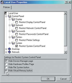 При использовании Windows 98 или Me найдите на дистрибутивном компакт-диске Windows файл poledit. exe. Если вам не удалось его разыскать, то спишите Редактор Системной политики с сайта www.microsoft.com/windows95/downloads. Запустите этот редактор, дважды щелкнув на файле poledit. exe (или на ярлыке для него). Если увидите запрос на файл шаблона, укажите admin. adm, списываемый вместе с программой, или найдите его и отметьте на жестком диске, а затем щелкните на "Открыть" (Open). Задайте опции "Файл? Открыть Реестр" (File? Open Registry) и для того, чтобы открыть диалоговое окно "Свойства локального пользователя" (Local User Properties), дважды щелкните на значке "Локальный пользователь" (Local User). Отметьте значок "Панель управления" и разверните все ветви под ним, нажав клавишу с "серая звездочка" (*) на цифровой панели клавиатуры. Здесь можно скрывать любые диалоговые закладки и кнопки Панели управления. Так, под ветвью "Система" включите функцию "Ограничить управление свойствами системы" (Restrict System Control Panel). После этого в списке, расположенном в нижней части диалогового окна, включите функции в тех позициях, которые требуется скрыть, например "Скрыть страницу устройств" (Hide Device Manager Page) или "Скрыть кнопку "Виртуальная память" (Hide Virtual Memory Button).