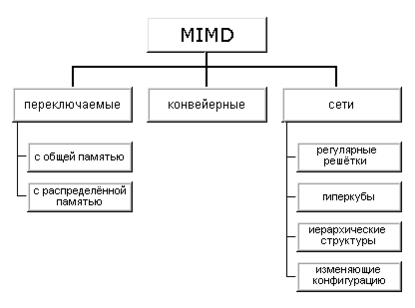 Как отмечалось выше (см. классификацию Флинна), класс MIMD чрезвычайно широк, причем наряду с большим числом компьютеров он объединяет и целое множество различных типов архитектур. Хокни, пытаясь систематизировать архитектуры внутри этого класса, получил иерархическую структуру, представленную на рисунке: