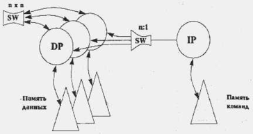 Примеров подобных переключателей можно привести очень много. Так, все матричные процессоры имеют переключатель типа 1-n для связи единственного процессора команд со всеми процессорами данных. В компьютерах семейства Connection Machine каждый процессор данных имеет свою локальную память, следовательно, связь будет описываться как n-n. В тоже время, каждый процессор команд может связаться с любым другим процессором, поэтому данная связь будет описана как nxn.