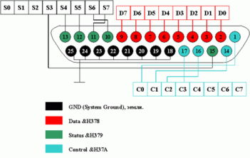 Из рис. видно, что выводы порта можно разделить на четыре группы: это 'земляные' выводы (не понятно чем руководствовались разработчики интерфейса LPT, сделав этих выводов аж 8 штук). Они обозначены черным цветом (контакты 18-25). Все они соединены между собой, поэтому для своих разработок в качестве земли можно использовать любой из них.