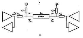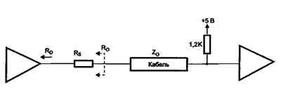 Выходной импеданс Ro, измеренный на разъеме, должен составлять 50╠5 Ом на уровне VoH~VoL. Для обеспечения заданного импеданса используют последовательные резисторы в выходных цепях передатчика. Согласование импеданса передатчика и кабеля снижает уровень импульсных помех.