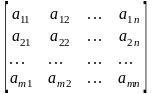Элементы ai1, ai2, ..., ain составляют i-ю строку (i=1,2,... m), элементы a1k ,a2k , ..., amk - k-й столбец (k=1, 2 , ..., n), aik – элемент, принадлежащий i – й строке и k – му столбцу матрицы, числа i, k называют индексами элемента. Строки и столбцы матрицы называют её рядами; под двумя параллельными рядами понимают две строки или два столбца матрицы. Матрицу, имеющую m строк и n столбцов, называют матрицей размеров m×n. Употребляются и более краткие обозначения матрицы размеров m×n:
