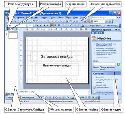 1. Загрузить приложение PоwеrPоint. По умолчанию Pоwеr Pоint открывается в режиме Обычный. То есть в окне приложения будет отображаться титульный слайд в режиме Обычный, в области Структуры/Слайды появится эскиз первого слайда, а в области задач будет отображаться панель «Приступая к работе».