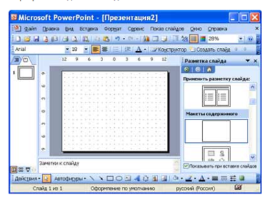 1. В открытом приложении PоwеrPоint выполнить команду Файл/Создать, а в области задач выбрать команду «Новая презентация». В результате этих действий в области задач откроется панель «Разметка слайда».