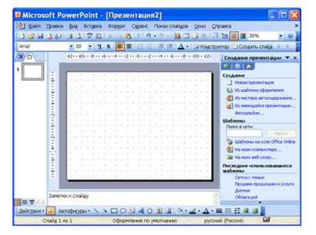 Создание новой презентации без дизайна и разметки слайдов, т.е. без применения встроенных шаблонов презентации и оформления является сложной задачей. Этот способ создания презентации следует использовать лишь в том случае, когда пользователь ясно представляет себе внешний вид создаваемой презентации, а также формат слайдов, которые будут входить в ее состав.