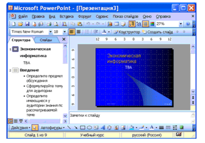 Строка меню предоставляет доступ ко всем важным командам программы PоwеrPоint. Панели инструментов предоставляют быстрый доступ к используемым командам. В Pоwеr Pоint используется группа команд меню Показ слайдов вместо меню Таблица редактора Wоrd.