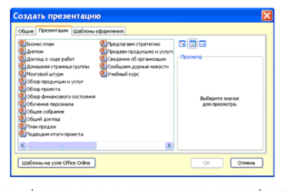 4. Второй шаг предполагает выбор одного из стандартных видов презентации, которые определяют ее основную идею и содержание (доклад, учебный курс и т.д.).
