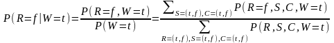 Все четыре переменные принимают булевы значения 0 — ложь, (f) или 1 — истина (t). Совместная вероятность P(R, S, C, W), таким образом, дается совокупной таблицей из 16 чисел. Таблица вероятностей нормирована, так что
