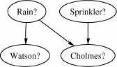 Приведем пример точных вычислений в простой байесовой сети, моделирующей задачу Шерлока Холмса. Обозначения и смысл переменных в сети : R —был ли дождь, S — включена ли поливальная установка, C — влажная ли трава у дома Холмса, и W — влажная ли трава у дома Ватсона.