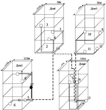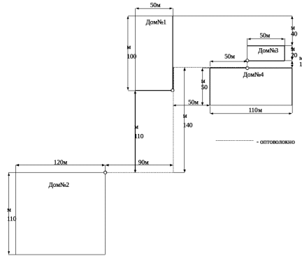 Учитывая расстояние между домами, расположение точек связи (маршрутизаторов) определим длину оптоволоконного кабеля, руководствуясь выше представленной схемой расположения домов: