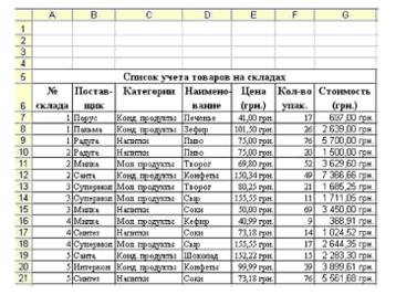 Список представляет собой электронную таблицу с большим объемом взаимосвязанной информации (список товаров на складах или список номеров телефонов и адресов абонентов). Список - это набор строк электронной таблицы со взаимосвязанными однотипными данными постоянного формата. Другими словами список - это плоская база данных, а строки и столбцы списка соответствуют записям и полям в базе данных. Образец списка представлен на рисунке.