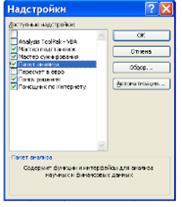 Функции, реализующие статистические методы обработки и анализа данных, в Excel реализованы в виде специальных программных средств - надстройки Пакета анализа, которая входит в поставку Microsoft Office и может устанавливаться по желанию пользователей. Установка надстройки Пакет анализа осуществляется так же, как и установка других надстроек с помощью команды Сервис/Надстройка. Далее необходимо установить флажок перед пунктом Пакет анализа и нажать ОК.