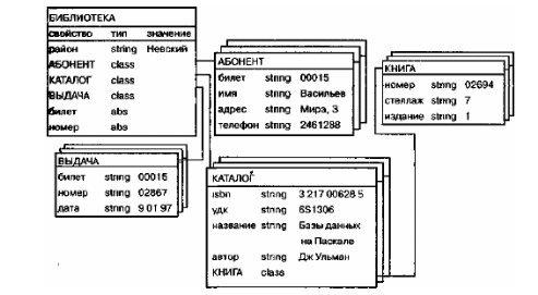 Здесь объект типа БИБЛИОТЕКА является родительским для объектов-экземпляров классов АБОНЕНТ, КАТАЛОГ и ВЫДАЧА. Различные объекты типа КНИГА могут иметь одного или разных родителей. Объекты типа КНИГА, имеющие одного и того же родителя, должны различаться по крайней мере инвентарным номером (уникален для каждого экземпляра книги), но имеют одинаковые значения свойств isbn, удк, название и автор.