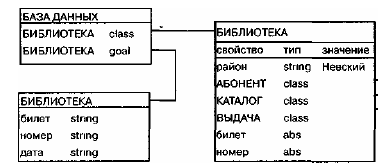 Определяемый пользователем объект, называемый объектом-целью (свойство объекта имеет тип goal), в общем случае может представлять собой подмножество всей хранимой в БД иерархии объектов. Объект-цель, а также результат выполнения запроса могут храниться в самой базе. Пример запроса о номерах читательских билетов и именах абонентов, получавших в библиотеке хотя бы одну книгу, показан на рис.2.