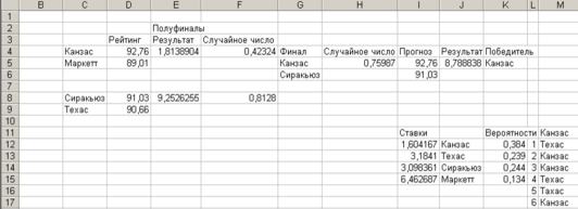 Теперь, как обычно, воспользуемся таблицей подстановки с одним параметром, чтобы пару тысяч раз воспроизвести полуфинал. Победители указаны в диапазоне ячеек М12:М2011. Скопировав из ячейки К12 в диапазон К13:К15 формулу СЧЕТЕСЛИ($M$12:$M$2011;J12)/2000, мы вычислим для каждой команды прогнозируемую вероятность победы: 38% для команды Канзаса, 24% для команды Сиракьюз, 24% для команды Техаса и 14% для команды Маркетта. Эти вероятности можно преобразовать в ставки по следующей формуле: