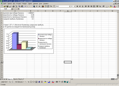 3. В ячейки В2 и В3 вводим соответственно вероятности 0,38 и 0,62, которые мы нашли в разделе 3. В ячейку В4 вводим формулу нахождения средней прибыли букмекера, т.е. =В1*(-В2)+В3*1.