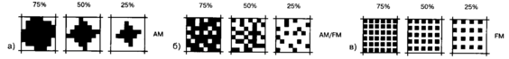 Рисунок 2 – Передача півтонів зміною: а) розміру друкарських елементів постійного кроку –"амплітудне растрування"; б) площі елементів і частоти їхнього розміщення – змішана "АМ/ЧМ модуляція"; в) частоти розміщення однакових елементів –"частотна модуляція"