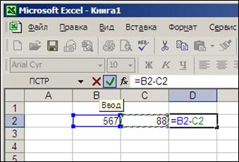 Например, если в ячейке D2 должна помещаться разность чисел из ячеек B2 и C2, то после установки курсора на D5 следует указать мышью на B2, ввести с клавиатуры знак “-”, указать мышью на C2 и нажать или “зеленую галочку”.
