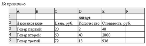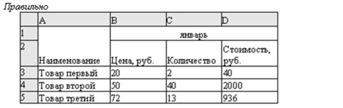Для таблиц со сложной структурой используйте объединение ячеек, но только там, где это действительно требуется.