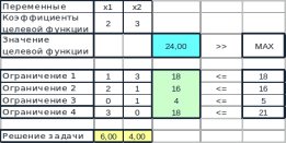 Средствами Excel мы получили, что надо произвести 6 ед. первой продукции и 4 ед. второй продукции. Максимальная выручка при этом равна 24.