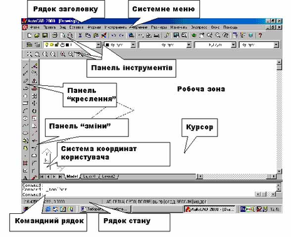 Системне меню і панелі інструментів. Зверху находиться рядок заголовку, а зразу під нею рядок системного (падаючого) меню AutoCad. Нижче розміщуються три строки, які зайнятті панелями інструментів. Зліва від робочої зони розміщенні "плаваючі" панелі інструментів. Їх можна переміщати в будь-яке місце екрану. В AutoCad існує ще багато інших панелей інструментів, які викликаються по мірі необхідності.