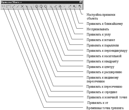 В ряді випадків є необхідність прив’язати точку вводу координати до точки на присутньому примітиві. Для цих цілей служить панель інструментів "прив’язка об’єктів" (рисунок 6).