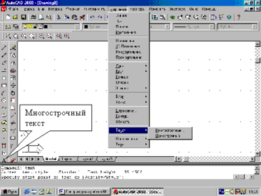 Порівняно короткі написи, які не вимагають внутрішнього форматування, створюються командами DText і Text. Щоб ввести багаторядковий текст, слід використовувати команду Mtext. Ввід команд можна здійснювати і через системне меню і через панелі інструментів (рисунок 7).