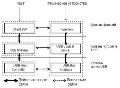 Система USB разделяется на три уровня с определенными правилами взаимодействия. Устройство USB делится на интерфейсную часть, часть устройства и функциональную часть. Хост тоже делится на три части - интерфейсную, системную и ПО устройства. Каждая часть отвечает только за определенный круг задач, взаимодействие между ними показано на рисунке 1.1.